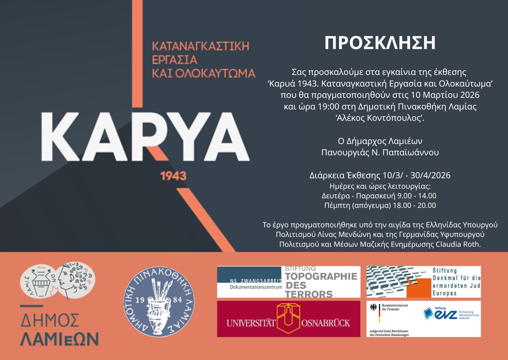 Ο Δήμος Λαμιέων και η Δημοτική Πινακοθήκη Λαμίας «Αλέκος Κοντόπουλος» φιλοξενούν από τις 10 Μαρτίου 2026 έως 30 Απριλίου 2026 την Έκθεση Συλλογικής Ιστορικής Μνήμης «Καρυά 1943. Καταναγκαστική εργασία και Ολοκαύτωμα».