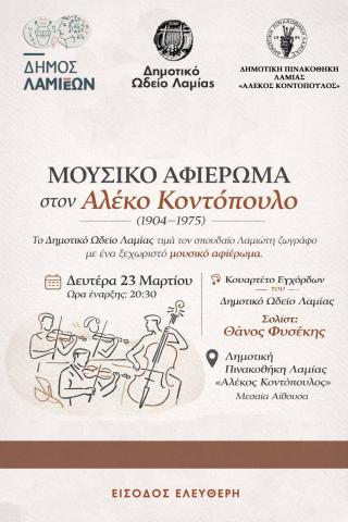 Τη Δευτέρα 23 Μαρτίου 2026 και ώρα 20.30 το κουαρτέτο εγχόρδων του Δημοτικού Ωδείου Λαμίας, με σολίστ τον Θάνο Φυσέκη, θα πραγματοποιήσει μουσικό αφιέρωμα στον Λαμιώτη ζωγράφο Αλέκο Κοντόπουλο (1904-1975) στη Μεσαία Αίθουσα της Δημοτικής Πινακοθήκης Λαμίας «Αλ. Κοντόπουλος».